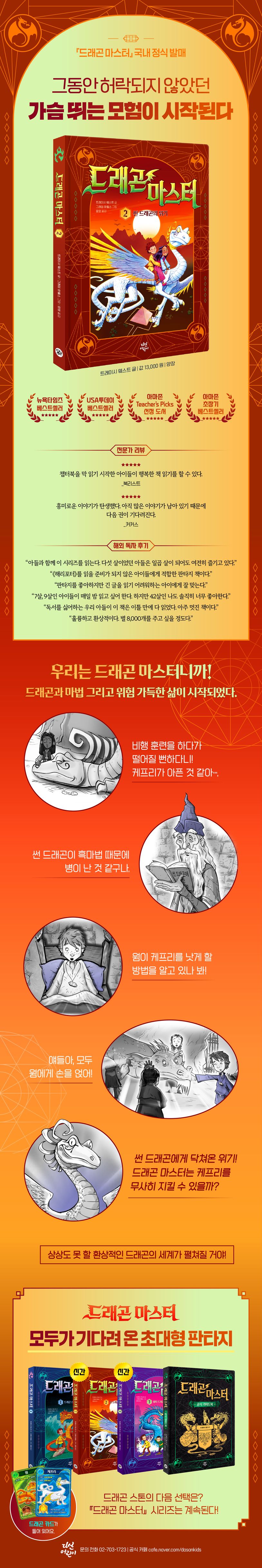 출간 즉시 아마존 베스트셀러에 등극하는 초대형 판타지! 『드래곤 마스터』 시리즈가 드디어 한국어판으로 출간되었다. 해외 독자들의 사랑을 듬뿍 받는 판타지 동화로, 이제 한국 독자들도 함께 즐길 수 있게 되었다. 2014년 첫 출간을 시작으로 9년 동안 시리즈를 이어 오며 꾸준한 인기를 유지할 수 있는 이유는 쉬운 문장과 속도감 있는 전개, 흡입력 넘치는 스토리 덕분이다. 이를 증명하듯이 아이들의 열광뿐만 아니라, 미국 초등학교 선생님들이 학생들의 독서 습관을 길러 주기 위해 강력 추천하는 책으로, 재미와 학습을 모두 잡을 수 있는 매력적인 작품이다.