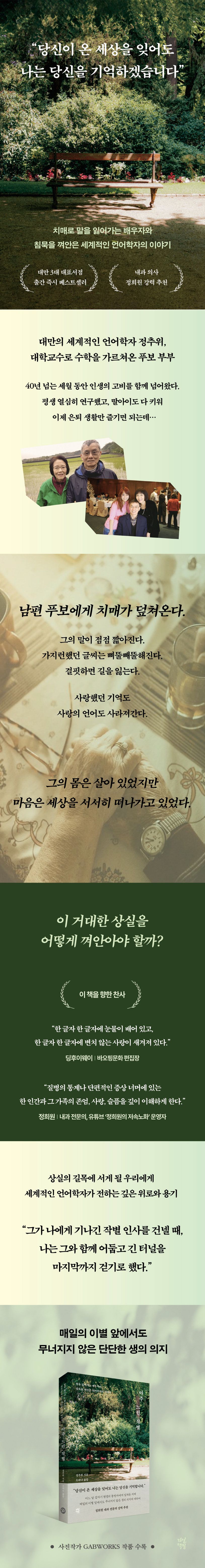 대만의 세계적 언어학자 정추위. 40년 넘는 세월을 매일 대화를 나누며 동고동락한 남편에게 어느 날 갑자기 치매가 덮쳐온다. 그는 수학 교수였을 만큼 논리적이며 지성으로 빛나는 사람이었지만 하루가 다르게 말이 짧아지고 기억을 잃는다. 사랑했던 기억도 사랑의 언어도 사라져간다. 수많은 책, 그 어떤 연구 자료로도 알 수 없었다. 몸은 살아 있지만 마음은 매일 세상을 떠나가는 배우자와의 이별을 받아들이는 방법을. 이것은 그가 보내는 아주 느린 작별 인사일까. 이 거대한 상실을 어떻게 끌어안아야 할까.