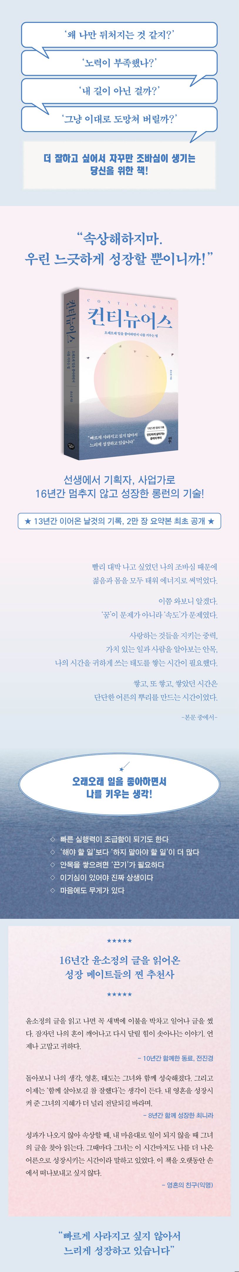 『컨티뉴어스』의 저자 윤소정에게도 이런 날이 있었다. 몸이 부서져라 일해도 성공하기만 하면 괜찮아질 거라 생각하며 숨 가쁘게 뛰었지만 20대 후반 암 판정을 받을 만큼 몸은 쇠약해졌고, 남편과의 관계도 깨지고, 지독한 무기력과 우울증을 겪었다.