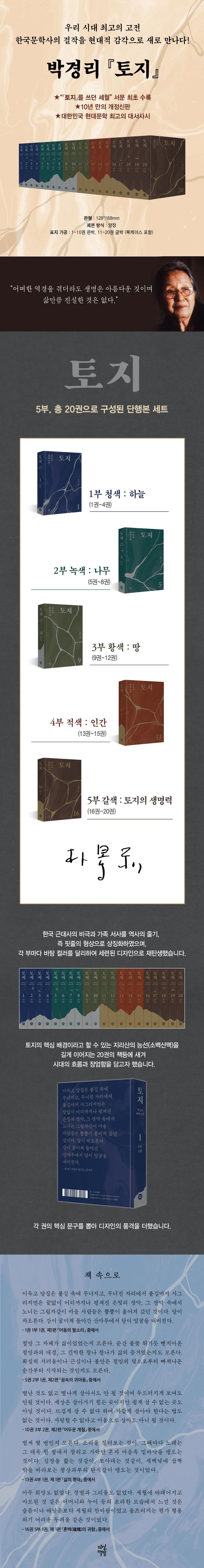 명실상부 한국 문학사의 기념비적 작품으로 자리하고 있는 박경리의 대하소설 『토지』가 첫 집필 54년 만에 현대적 감각으로 다시 탄생했다. 주지하다시피 우리 근대사의 굵직한 사건들이 선명하게 기록되어 있는 『토지』는 우리말의 미적 감각을 첨예하게 보여주는 작품이다. 이러한 『토지』는 누구도 부인할 수 없는 한국문학의 대표 작품으로서 오늘날까지 범국민적으로 읽혀온 것이 사실이다. 한말부터 일제강점기까지 근대 우리 민족이 겪은 피탈의 상처들을 아우르며 격변하는 시대 속 한민족의 삶을 생생하게 그려낸 대하소설 『토지』. 한국 문학사에 다시없을 걸작이 원전을 충실하게 살린 편집과 고전에 대한 선입견을 완벽하게 깨부수어줄 디자인으로 새 시대의 새 독자를 만날 준비를 마쳤다.