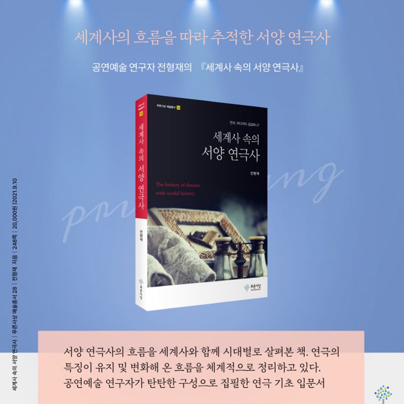 공연예술 연구자인 전형재 교수의 『세계사 속의 서양 연극사』가 〈푸른사상 예술총서 28〉로 출간되었다. 서양 연극사의 흐름을 세계사와 함께 시대별로 살펴보고 있다. 아울러 연극의 특징이 유지 및 변화해 온 흐름을 체계적으로 정리하고 있다. 탄탄한 구성으로 집필한 연극 기초 입문서이다.