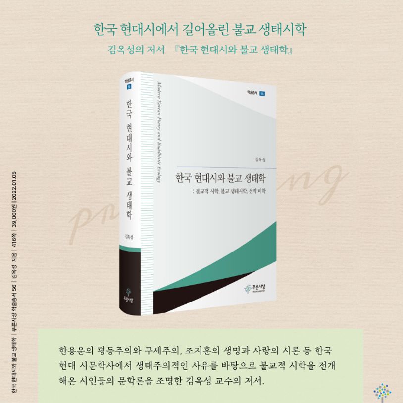 김옥성 교수(단국대학교 국어국문학과)의 『한국 현대시와 불교 생태학』이 푸른사상사의 〈학술총서 56〉으로 출간되었다. 한용운의 평등주의와 구세주의, 조지훈의 생명과 사랑의 시론 등 한국 현대 시문학사에서 생태주의적인 사유를 바탕으로 불교적 시학을 전개해온 시인들의 문학론을 조명한다.