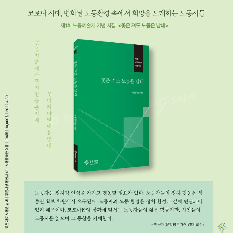노동문학관에서 주최하는 제1회 노동예술제 기념 시집 『꽃은 져도 노동은 남네』가 〈푸른사상 동인시 13〉으로 출간되었다. 불평등한 사회구조 속에서 힘겨운 삶을 영위하면서도 현실 인식을 잃지 않고 있는 노동자들을 대변하는 41명의 시인이 노래한 작품들이다. 노동과 노동예술의 가치를 되새기는 시편들은 시대의 희망을 찾는 노래로 울려 퍼진다.