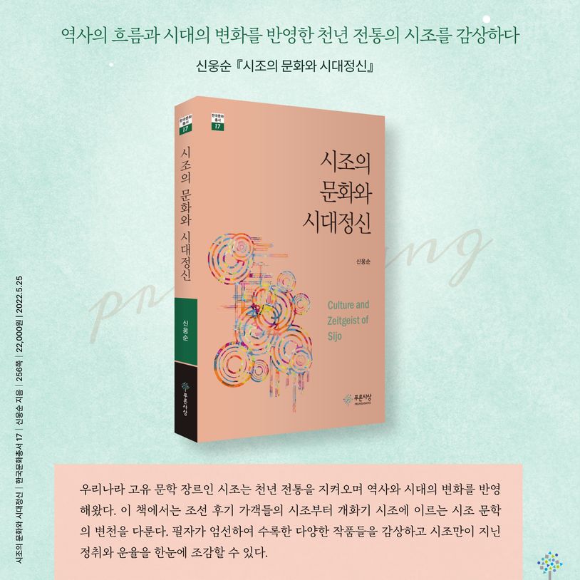 신웅순 교수(중부대 명예교수)의 『시조의 문화와 시대정신』이 푸른사상사의 〈한국문화총서 17〉로 출간되었다. 우리나라 고유 문학 장르인 시조는 천년 전통을 지켜오며 역사와 시대의 변화를 반영해왔다. 이 책에서는 조선 후기 가객들의 시조부터 개화기 시조에 이르는 시조 문학의 변천을 다룬다.