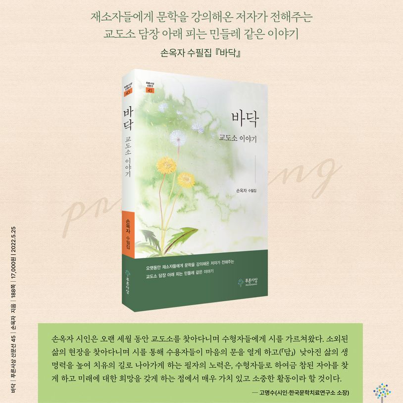 손옥자 시인의 수필집 『바닥』이 〈푸른사상 산문선 45〉로 출간되었다. 저자는 오랜 세월 교도소를 찾아다니며 재소자들에게 시를 강의해왔다. 문학의 힘으로 소외된 이들의 마음의 문을 열고 새로운 삶의 길로 인도하는 따뜻한 이야기들이 잔잔한 울림을 준다.