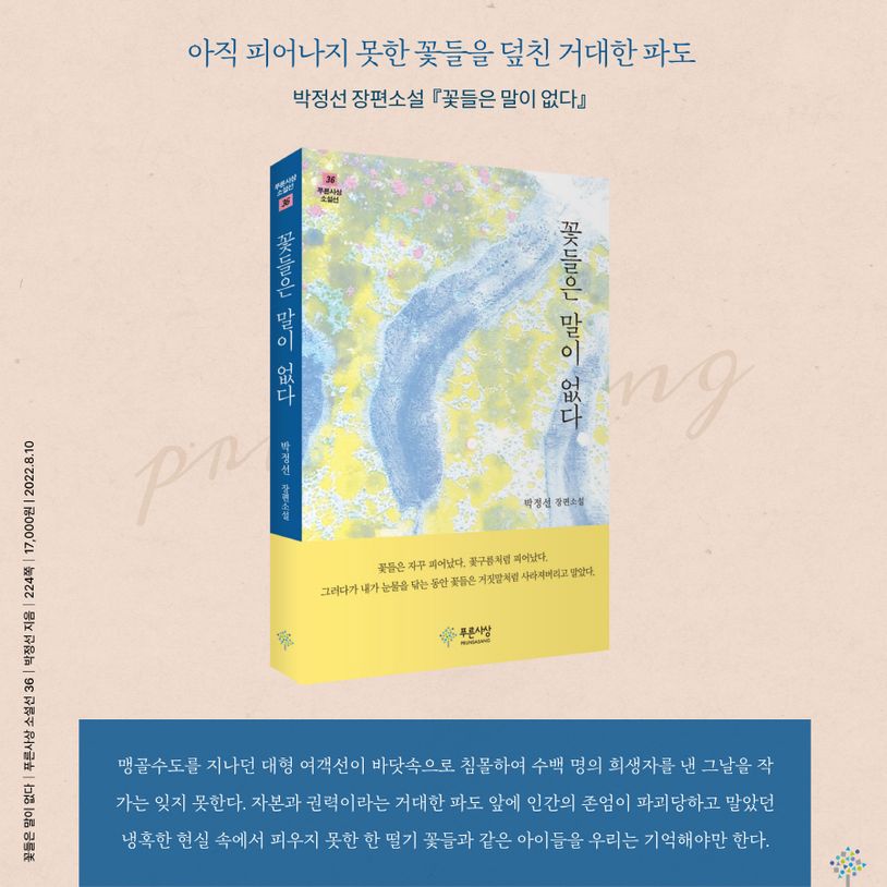 박정선 작가의 장편소설 『꽃들은 말이 없다』가 〈푸른사상 소설선 36〉로 출간되었다. 맹골수도를 지나던 대형 여객선이 바닷속으로 침몰하여 수백 명의 희생자를 낸 그날을 작가는 잊지 못한다. 자본과 권력이라는 거대한 파도 앞에 인간의 존엄이 파괴당하고 말았던 냉혹한 현실 속에서 피우지 못한 한 떨기 꽃들과 같은 아이들을 우리는 기억해야만 한다.