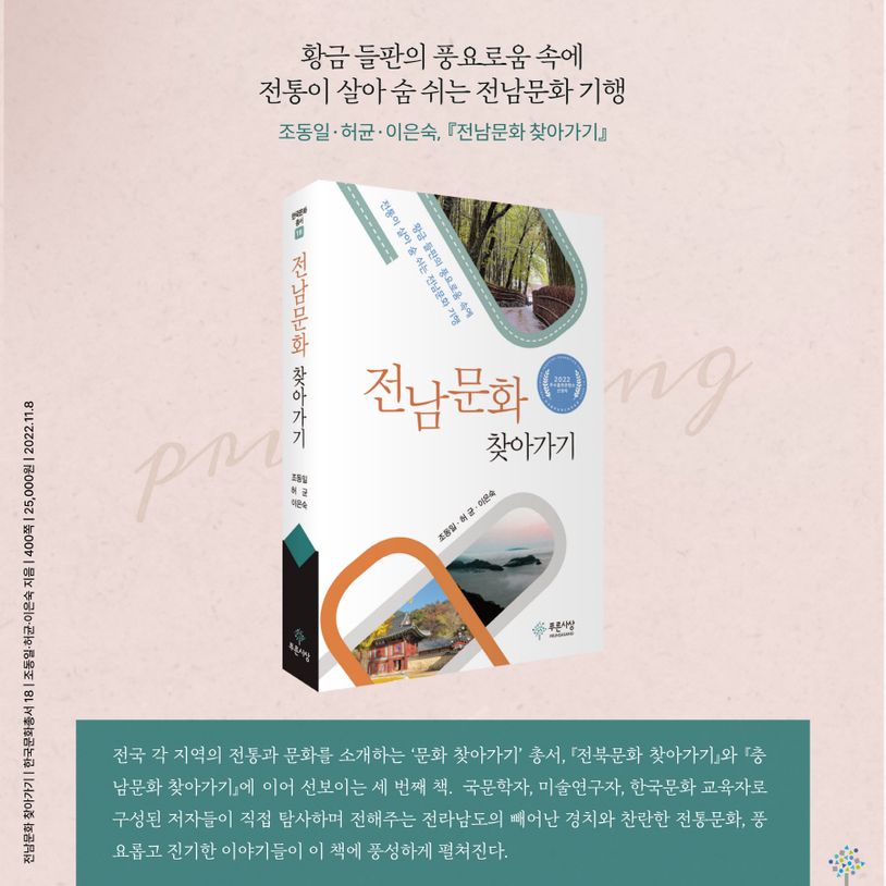 전국 각 지역의 전통과 문화를 소개하는 세 번째 책 『전남문화 찾아가기』가 푸른사상 〈한국문화총서 18〉로 출간되었다. 국문학자, 미술연구자, 한국문화 교육자로 구성된 저자들이 직접 탐사하며 전해주는 전라남도의 빼어난 경치와 찬란한 전통문화, 풍요롭고 진기한 이야기들이 이 책에 풍성하게 펼쳐진다.