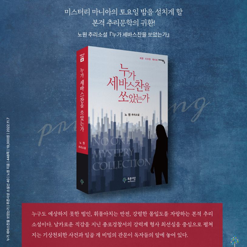 노원 작가의 추리소설 『누가 세바스찬을 쏘았는가』가 〈푸른사상 소설선 40〉으로 출간되었다. 누구도 예상하지 못한 범인, 휘몰아치는 반전, 강렬한 몰입도를 자랑하는 본격 추리소설이다. 날카로운 직감을 지닌 종로경찰서의 강력계 형사 최선실을 중심으로 펼쳐지는 기상천외한 사건과 일곱 개 비밀의 관문이 독자들의 앞에 놓여 있다.