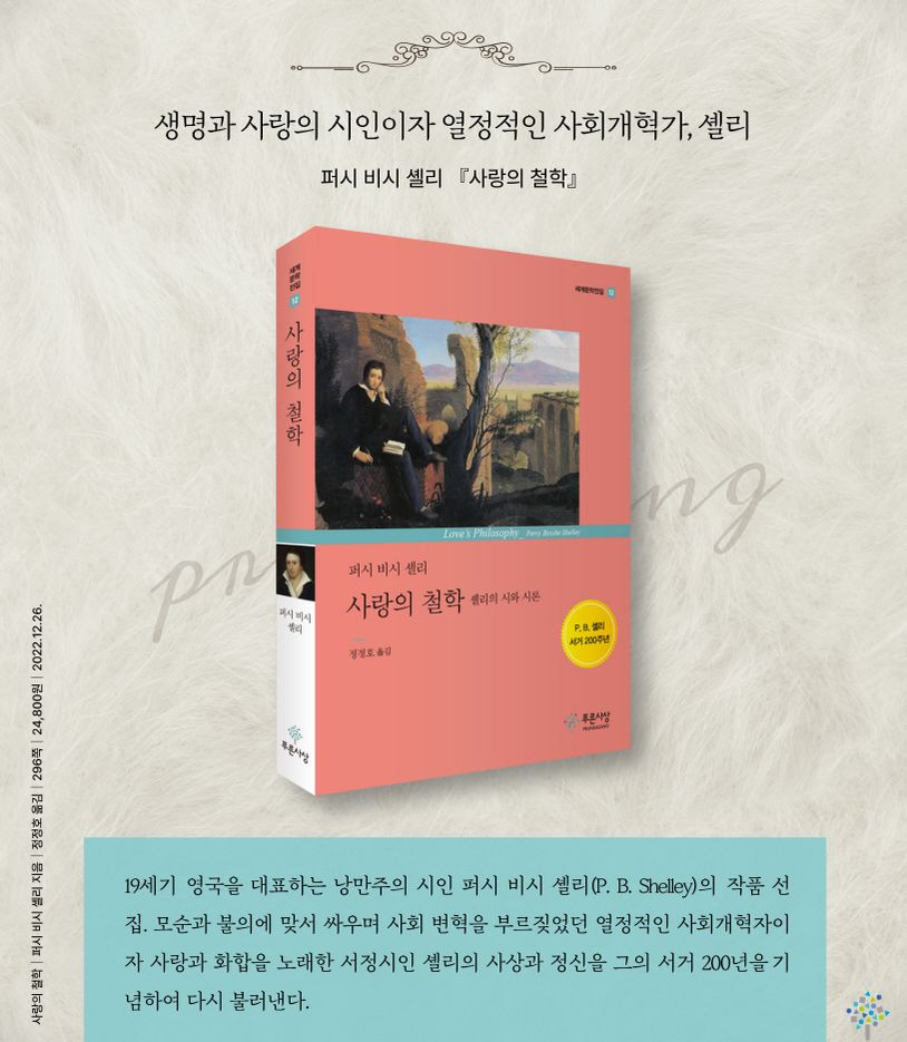 19세기 영국을 대표하는 낭만주의 시인 퍼시 비시 셸리(P. B. Shelley)의 작품 선집 『사랑의 철학』(정정호 옮김)이 푸른사상사의 〈세계문학전집 12〉로 출간되었다. 모순과 불의에 맞서 싸우며 사회 변혁을 부르짖었던 열정적인 사회개혁자이자 사랑과 화합을 노래한 서정시인 셸리의 사상과 정신을 그의 서거 200년을 기념하여 다시 불러낸다.