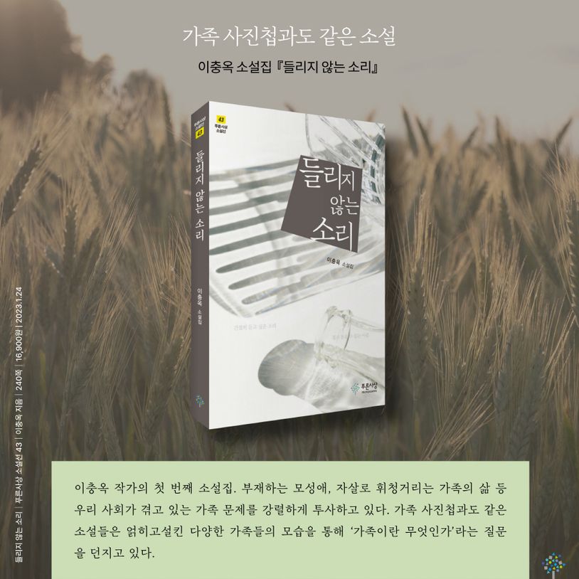 이충옥 작가의 첫 번째 소설집 『들리지 않는 소리』가 〈푸른사상 소설선 43〉으로 출간되었다. 부재하는 모성애, 자살로 휘청거리는 가족의 삶 등 우리 사회가 겪고 있는 가족 문제를 강렬하게 투사하고 있다. 가족 사진첩과도 같은 소설들은 얽히고설킨 다양한 가족들의 모습을 통해 ‘가족이란 무엇인가’라는 질문을 던지고 있다.