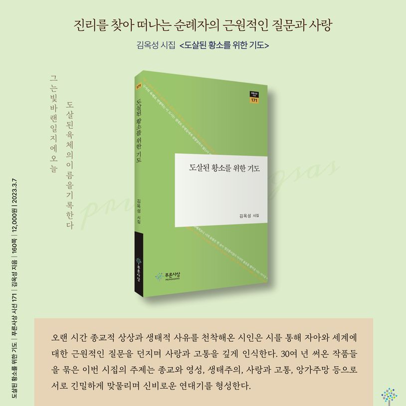 김옥성 시인의 첫 시집 『도살된 황소를 위한 기도』가 〈푸른사상 시선 171〉로 출간되었다. 오랜 시간 종교적 상상과 생태적 사유를 천착해온 시인은 시를 통해 자아와 세계에 대한 근원적인 질문을 던지며 사랑과 고통을 깊게 인식한다. 30여 년 써온 작품들을 묶은 이번 시집의 주제는 종교와 영성, 생태주의, 사랑과 고통, 앙가주망 등으로 서로 긴밀하게 맞물리며 신비로운 연대기를 형성한다.