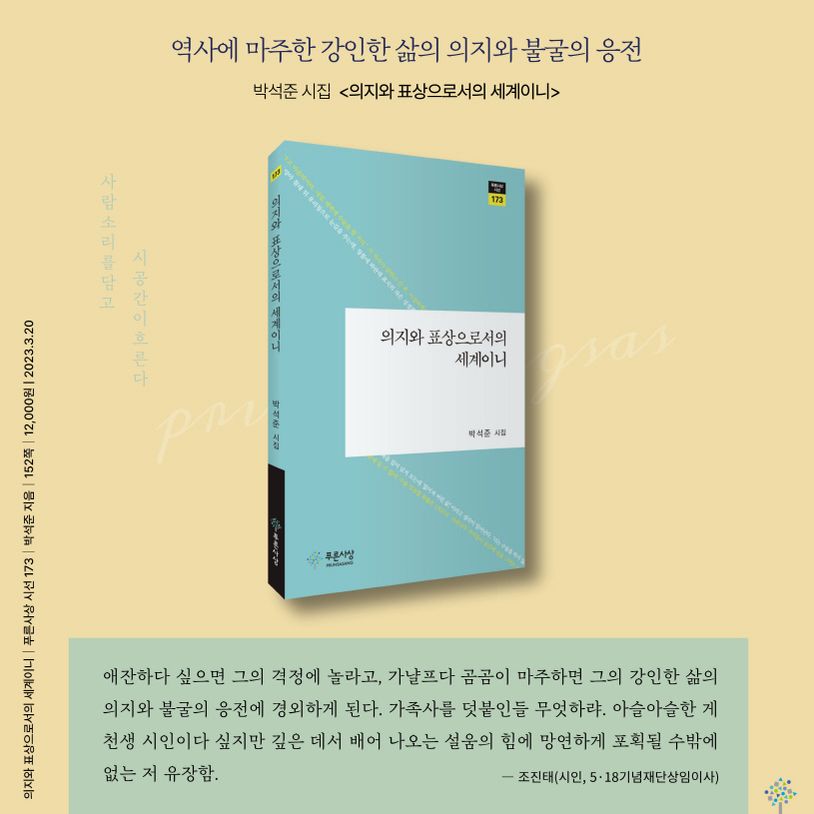박석준 시인의 시집 『의지와 표상으로서의 세계이니』가 〈푸른사상 시선 173〉으로 출간되었다. 한국 민주화 과정을 거치며 갖은 고통을 겪었던 한 개인의 가족사를 비롯해 음울한 도시의 풍경과 소시민의 삶이 형상화되어 있다. 시대적 수난 속에서 온몸에 새긴 삶의 감각과 절망의 노래에서 시인의 강인한 삶의 의지와 응전 의식을 느낄 수 있다.