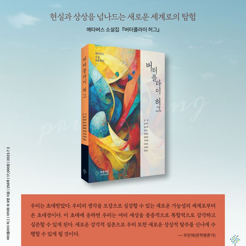 메타버스를 소재로 한 소설 10편을 묶은 『버터플라이 허그』가 푸른사상에서 출간되었다. 중견 작가 열 명의 뜻을 모은 이 작품집에서는 꿈꾸던 것들을 오감으로 생생하게 체험하는 새로운 세계가 펼쳐진다. 현실과 가상이 뒤섞인 메타버스 세계에서 문학의 상상력은 더욱 강력해진다.