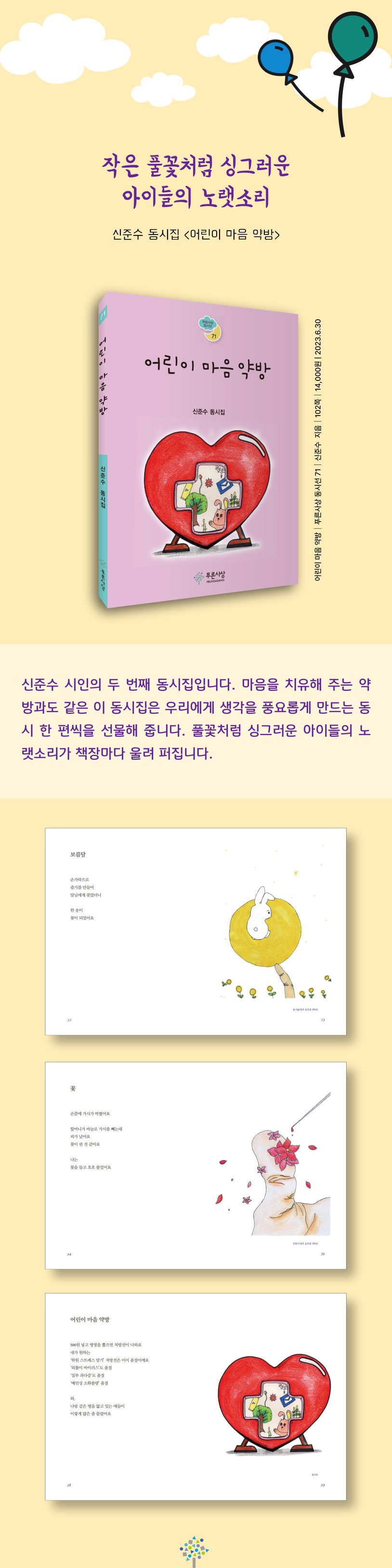 신준수 시인의 두 번째 동시집 『어린이 마음 약방』이 〈푸른사상 동시선 71〉로 출간되었습니다. 마음을 치유해 주는 약방과도 같은 이 동시집은 우리에게 생각을 풍요롭게 만드는 동시 한 편씩을 선물해 줍니다. 풀꽃처럼 싱그러운 아이들의 노랫소리가 책장마다 울려 퍼집니다.