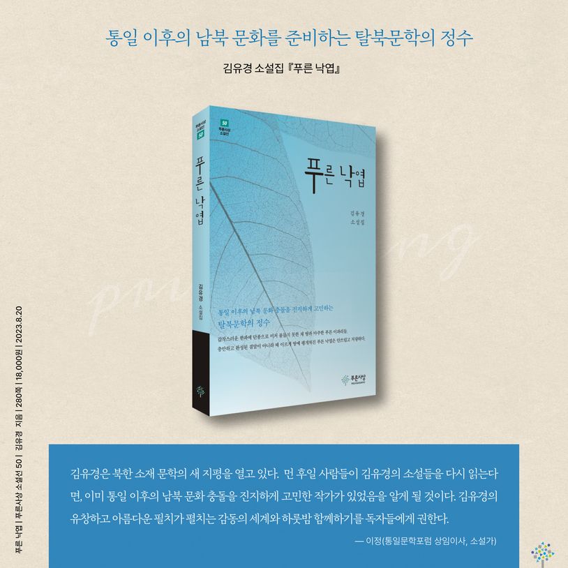 탈북작가 김유경의 세 번째 소설집 『푸른 낙엽』이 〈푸른사상 소설선 50〉으로 출간되었다. 목숨을 건 사투 끝에 한국 사회로 정착하는 과정에서 겪는 탈북민들의 고민과 갈등을 생생하게 그렸다. 목소리 없는 존재로 살아온 이들의 이야기를 진솔하면서도 따뜻한 시선으로 그려내어 공감과 이해의 계기를 마련해준다.