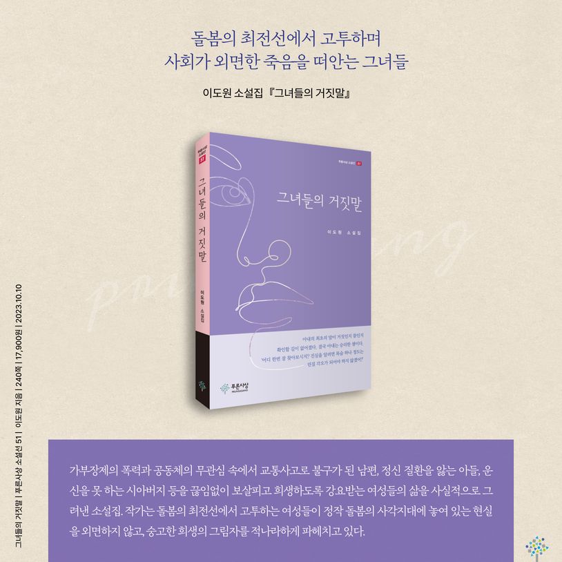 이도원 작가의 첫 번째 소설집 『그녀들의 거짓말』이 〈푸른사상 소설선 51〉로 출간되었다. 가부장제의 폭력과 공동체의 무관심 속에서 교통사고로 불구가 된 남편, 정신 질환을 앓는 아들, 운신을 못 하는 시아버지 등을 끊임없이 보살피고 희생하도록 강요받는 여성들의 삶을 사실적으로 그려내었다. 작가는 돌봄의 최전선에서 고투하는 여성들이 정작 돌봄의 사각지대에 놓여 있는 현실을 외면하지 않고, 숭고한 희생의 그림자를 적나라하게 파헤치고 있다.