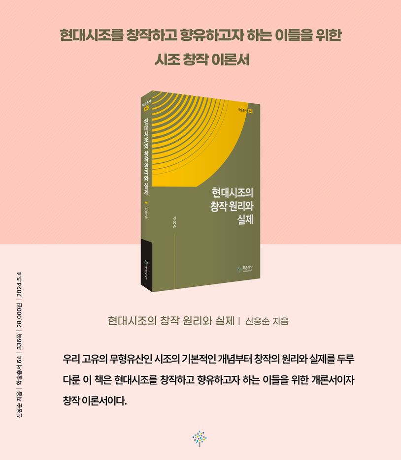 신웅순 교수(중부대 명예교수)의 『현대시조의 창작 원리와 실제』가 푸른사상 〈학술총서 64〉로 출간되었다. 우리 고유의 무형유산인 시조의 기본적인 개념부터 창작의 원리와 실제를 두루 다룬 이 책은 현대시조를 창작하고 향유하고자 하는 이들을 위한 개론서이자 창작 이론서이다.