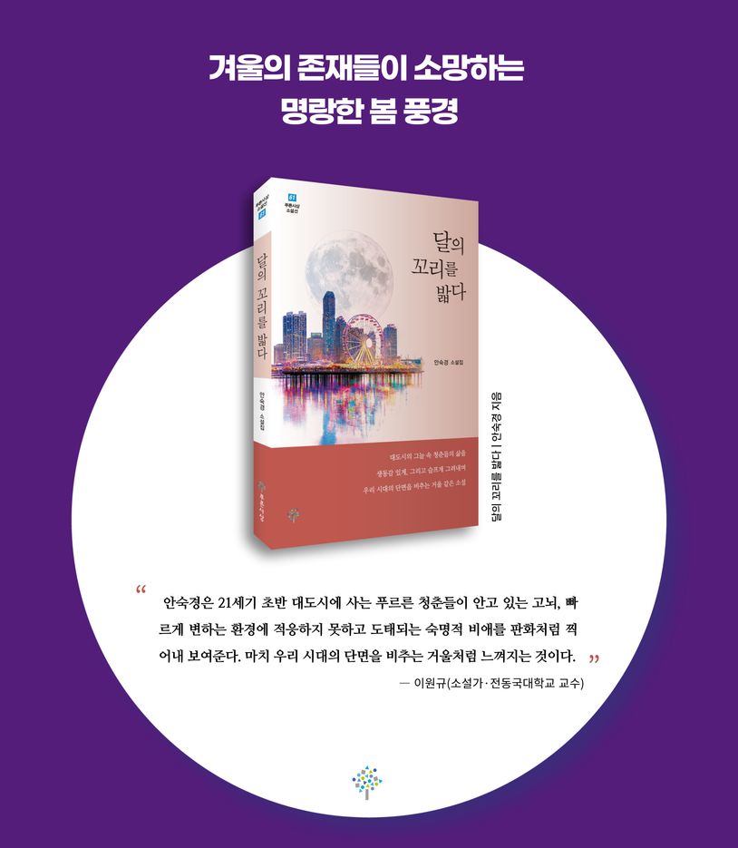 안숙경 작가의 첫 소설집 『달의 꼬리를 밟다』가 푸른사상 소설선 61로 출간되었다. 빠르게 변해가는 도시의 냉혹한 현실에 적응하지 못하는 청춘들의 비애와 고뇌를 보여주는 작품들이다. 작가는 우리 시대의 겨울 같은 존재들이 소망하는 봄 풍경을 그려내어 소외된 이들을 따뜻하게 보듬어준다.