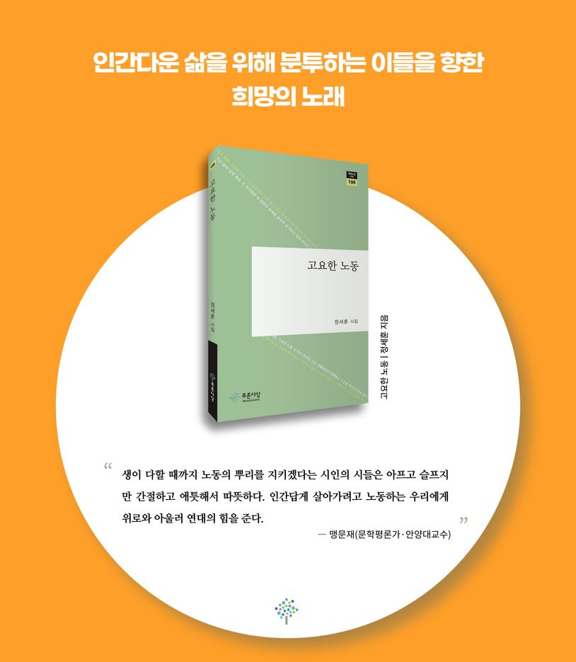 정세훈 시인의 시집 『고요한 노동』이 푸른사상 시선 198로 출간되었다. 현실의 불평등과 불의, 부조리함에 끊임없이 저항해온 시인은 이 시집에서 가난하고 힘없는 노동자를 위한 투쟁의 노래를 부른다. 인간다운 삶을 살아가기 위해 분투하는 이들을 향한 공감과 연대가 사라지지 않는 희망으로 다가온다.