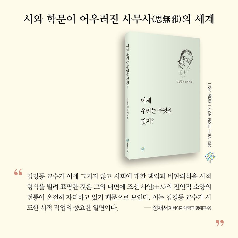 김경동 교수(서울대학교 명예교수)의 세 번째 시집 『이제 우리는 무엇을 짓지?』가 푸른사상사에서 출간되었다. 한국 사회학계의 원로인 김경동 교수는 의외로 이미 두 권이 시집을 출간한 시인이기도 하다. 전통적 의미의 선비라 할 만한 그의 시집에는 사회학자로서의 날카로운 현실인식뿐만 아니라 이웃과 자연에 대한 따뜻하고 소박한 감성까지 담겨 있어 읽는 이의 마음을 편안하게 한다.
