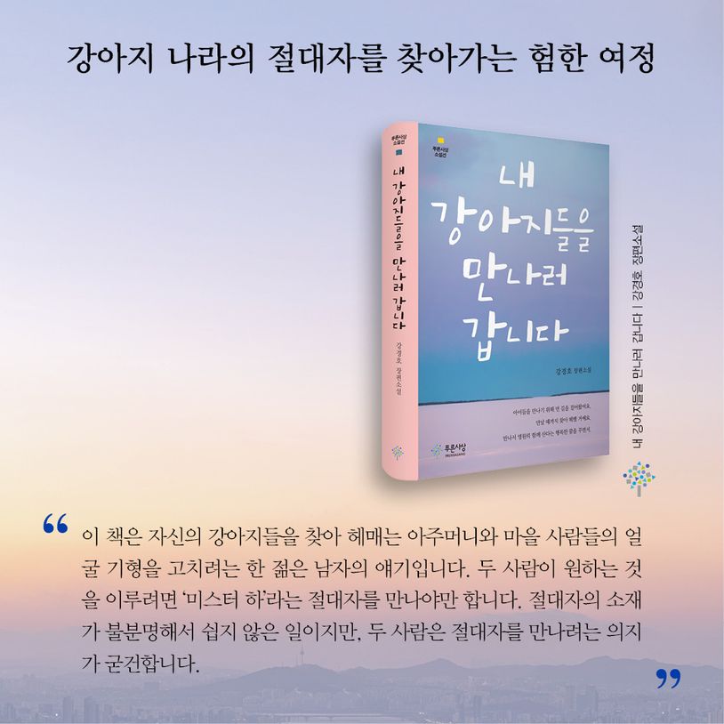 강경호 작가의 장편소설 『내 강아지들을 만나러 갑니다』이 푸른사상사에서 출간되었다. 작가는 우리가 사는 세계와 비슷한 듯 다른 신비한 세계에서 ‘미스터 하’라는 절대자를 찾아가는 주인공의 여정으로 독자를 안내한다. 독자는 어느 날 낯선 세계ᅌᅦ 뚝 떨어진 주인공이 되어 위험과 좌절을 함께 겪으며 인간과 세계의 본질에 대해 잠시 생각해보게 될 것이다.
