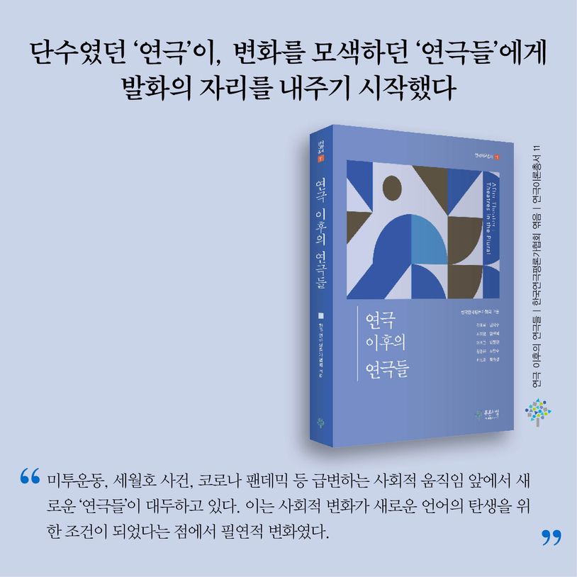 한국연극평론가협회에서 엮은 『연극 이후의 연극들』이 푸른사상의 ‘연극이론총서 11’로 출간되었다. 강단과 현장에서 연극을 실험하고 비평해온 열 명의 필자들이 21세기 새로운 연극적 흐름에 대한 분석과 통찰을 제공한다.