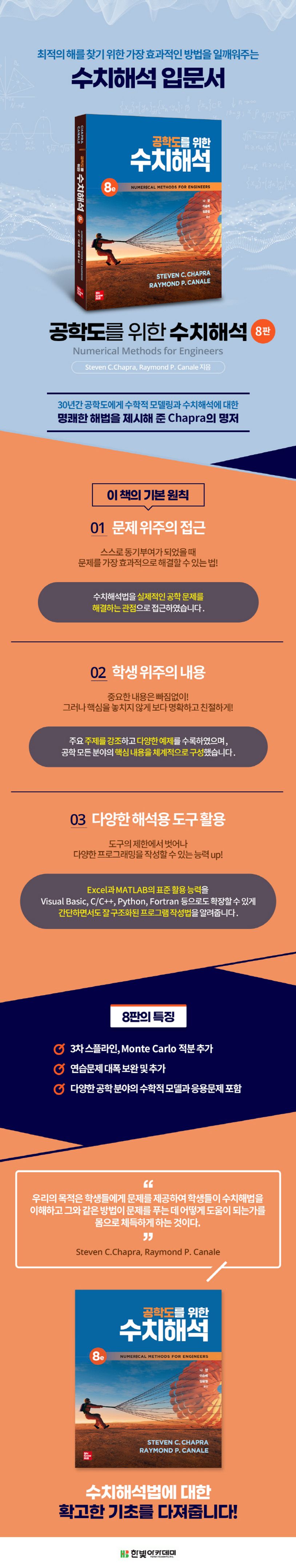 Chapra와 Canale의 『공학도를 위한 수치해석』은 지난 30년간 수치해석에 대한 교육과 학습법을 주도하며 성공적으로 이끌어왔다. 본 8판은 이러한 교육 기법을 유지하고 있으며, 공학적 문제 해결을 위한 방법들이 어떻게 적용되는지에 중점을 두었다. 이 책은 공학을 전공하는 학생들에게 효과적으로 수치해석의 기초를 가르치는 데 주력하고, 학생과 실무 엔지니어 모두 사용하는 표준 수치해석법을 다룬다. 본 개정판에는 3차 스플라인, Monte Carlo 적분에 대한 내용을 포함해 새롭고 확장된 연습문제를 추가하였다. 대부분의 문제는 이전의 버전과 다른 계산결과가 나오도록 개정되었다. 또한 이전 판과 마찬가지로 다양한 공학 분야의 수학적 모델과 응용문제를 포함시켰다.