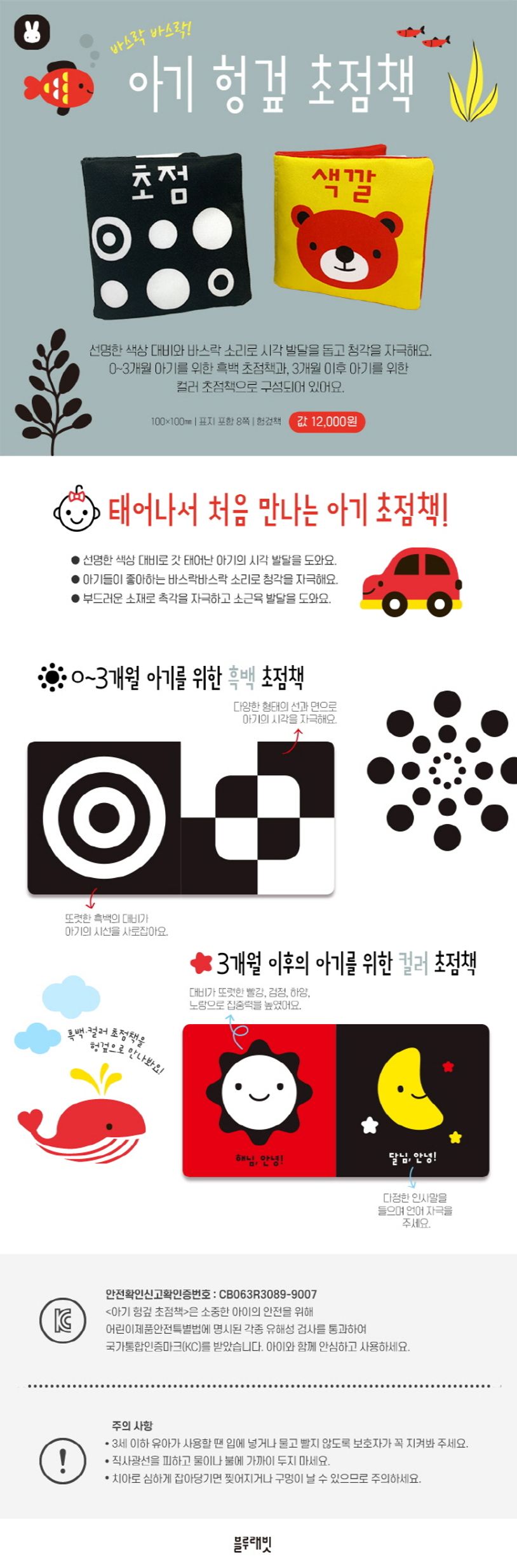 [아기 헝겊 초점책]에는 0~3개월 아기에게 알맞은 흑백 패턴을 담은 [초점]과 3개월 이후의 아기를 위한 컬러 초점책 [색깔]이 담겨 있습니다.