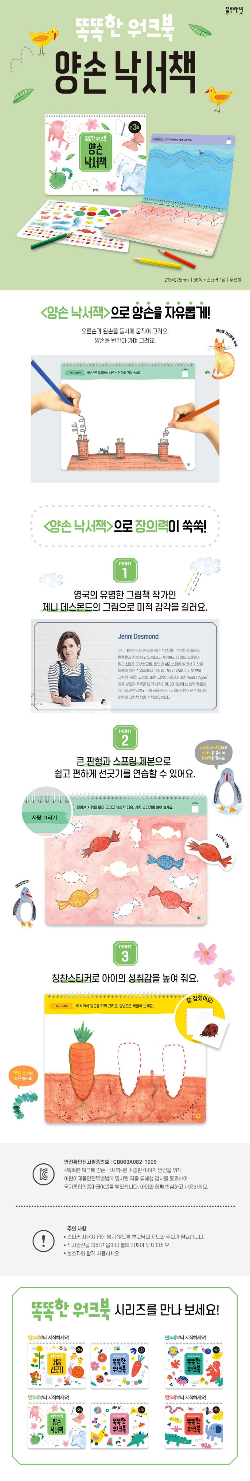 [똑똑한 워크북 양손 낙서책]은 빗줄기 그리기, 산 그리기, 파도 그리기, 점선 그리기, 무늬 그리기, 색칠하기 등 양손을 이용해서 할 수 있는 다양한 낙서 놀이와 학습이 끝날 때마다 붙여 주는 칭찬 스티커로 아이의 의욕을 쑥쑥 길러 줍니다.