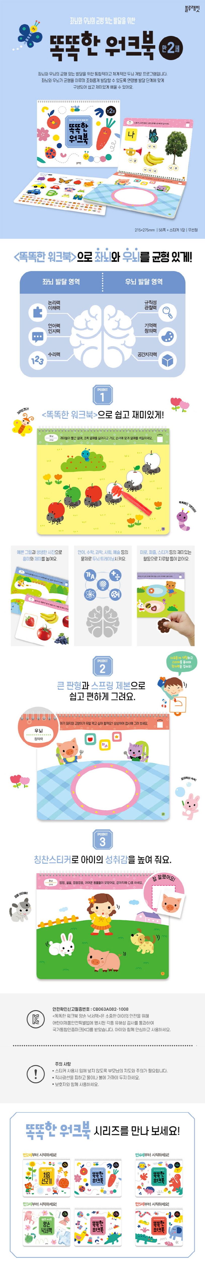 〈똑똑한 워크북〉은 우리 아이들의 고른 두뇌 발달을 위해 연령별 두뇌 활용도를 고려한 체계적인 프로그램으로, 좌뇌와 우뇌가 조화를 이루며 통합적으로 발달할 수 있도록 도울 것입니다. 한 권 안에 좌뇌 발달 영역인 논리력, 이해력, 언어력, 인지력, 수리력과 우뇌 발달 영역인 규칙성, 관찰력, 기억력, 창의력, 공간지각력의 고른 학습을 할 수 있어 좌뇌와 우뇌의 균형 있는 발달을 돕지요. 또한 학습이 끝날 때마다 붙여 주는 칭찬 스티커는 아이의 의욕을 쑥쑥 길러 줍니다.