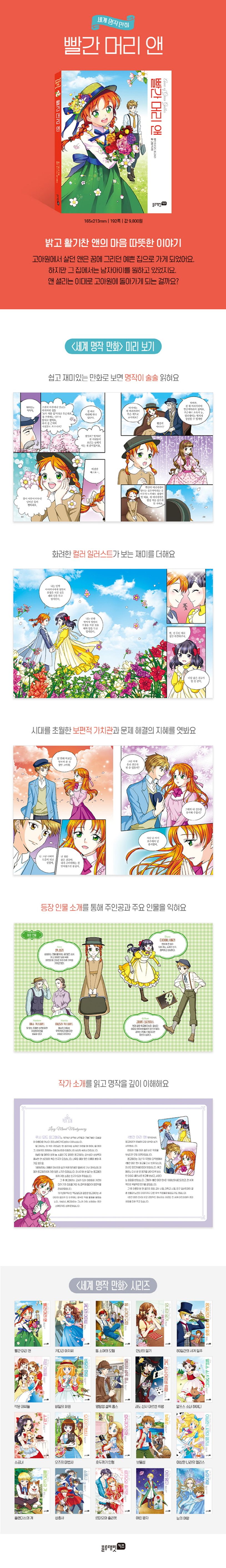 주근깨 가득한 얼굴에 볼품없이 마른 체구의 빨간 머리 앤은 고아이지만 풍부한 상상력을 가진 사랑스러운 소녀예요. 앤은 고아원을 떠나 꿈에 그리던 예쁜 초록 지붕 집으로 가게 되었어요. 하지만 사실 그 집에서는 남자아이를 원하고 있었지요. 앤 셜리는 이대로 고아원에 돌아가게 되는 걸까요? 밝고 사랑스러운 소녀의 성장기 〈빨간 머리 앤〉을 만화로 만나 보세요.