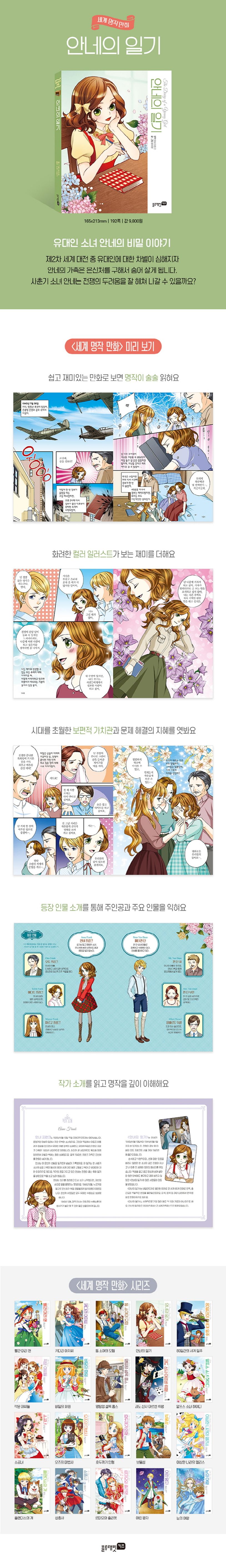 제2차 세계 대전 중 유대인에 대한 차별이 심해지자 안네의 가족은 은신처를 구해서 숨어 살게 됩니다. 사춘기 소녀 안네는 전쟁의 두려움을 잘 헤쳐 나갈 수 있을까요? 전쟁이 지나고 난 이후 전 세계에 희망의 메시지를 주었던 한 소녀의 이야기 〈안네의 비밀〉을 만화로 만나 보세요.