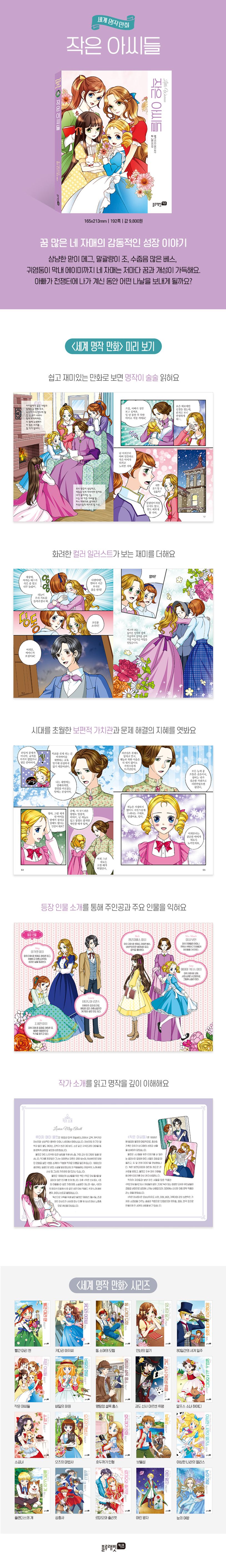 상냥한 맏이 메그, 말괄량이 조, 수줍음 많은 베스, 귀염둥이 막내 에이미까지 네 자매는 저마다 꿈과 개성이 가득해요. 가끔 어려운 형편에 불평 불만을 하곤 하지만요. 아빠가 전쟁터에 나가 계신 동안 어떤 나날을 보내게 될까요? 마치가 네 자매의 이야기 〈작은 아씨들〉을 만화로 만나 보세요.