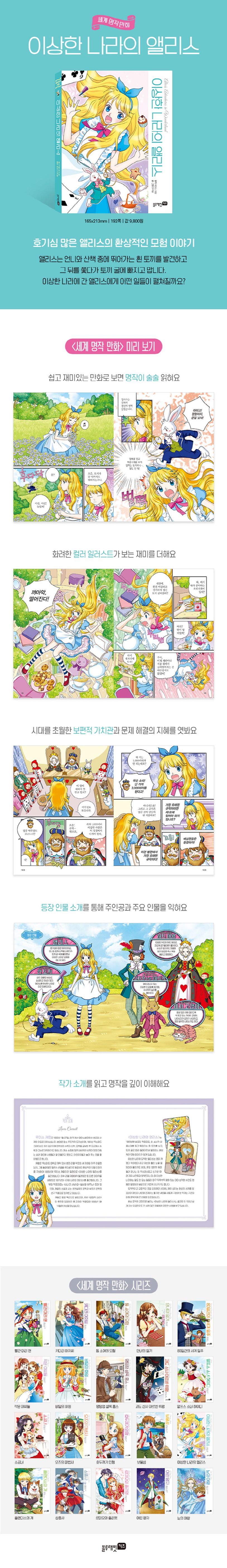 언니와 산책 중에 뛰어가는 흰 토끼를 본 앨리스는 궁금한 마음에 뒤를 쫓다가 토끼 굴에 빠지고 맙니다. 이상한 나라에 간 앨리스에게 어떤 일들이 펼쳐질까요? 재치 넘치는 활기찬 세상이 펼쳐지는 환상 문학의 고전 〈이상한 나라의 앨리스〉를 만화로 만나 보세요.