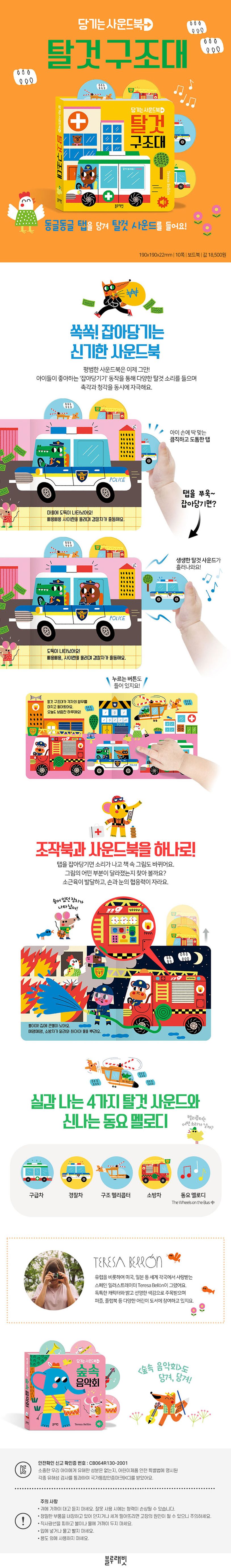 탭을 당기면 구급차, 경찰차, 구조 헬리콥터, 소방차의 4가지 탈것 사운드가 나오고 마지막 페이지에 있는 버튼을 누르면 동요 〈The Wheels on the Bus〉의 멜로디가 흘러나와요. 아이들에게 친숙한 탈것들이 각각 어떤 소리를 내고 무슨 일을 하는지 쉽게 알아볼 수 있어요.