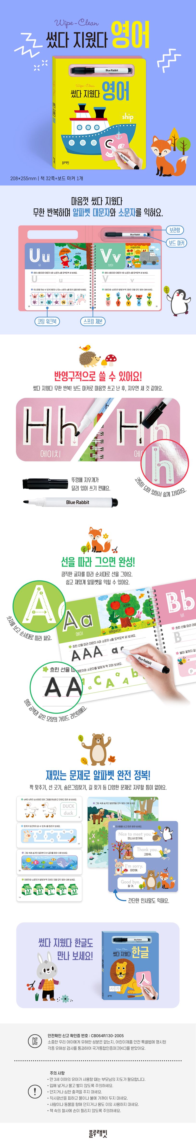 전용 보드 마커를 사용하여 몇 번이고 쓰고 지우며 반영구적으로 사용할 수 있어요. 보드 마커 뚜껑에 지우개가 달려있어 쓰고 지우기 편리하지요. 글씨 쓰기를 처음 경험하는 아이들이 쓰기 편하도록 180도로 활짝 펼쳐지는 내지에 굵은 보드 마커로 쓱쓱 쉽게 쓰고, 틀리면 싹싹 쉽게 지우고 다시 쓸 수 있어 아이들의 첫 글씨 연습에 사용하기 좋아요.