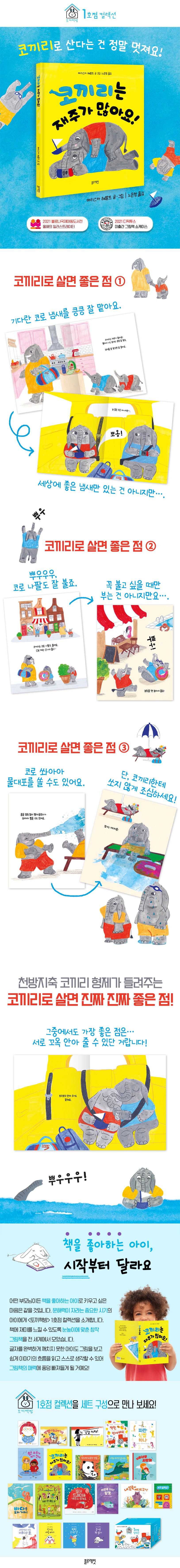 코끼리는 재주가 많아요. 기다란 코로 멀리서 나는 냄새도 킁킁 잘 맡고, 물건도 척척 잘 잡고요. 뿌우우우, 코로 나팔도 잘 불죠. 쏴아아, 강력한 물대포도 쏠 수 있어요. 무엇보다 장난을 아주 잘 친답니다! 천방지축 코끼리 형제가 들려주는 코끼리로 살면 진짜 진짜 좋은 점! 그중에서도 가장 좋은 점은… 서로서로 꼬옥 안아 줄 수 있는 거래요!