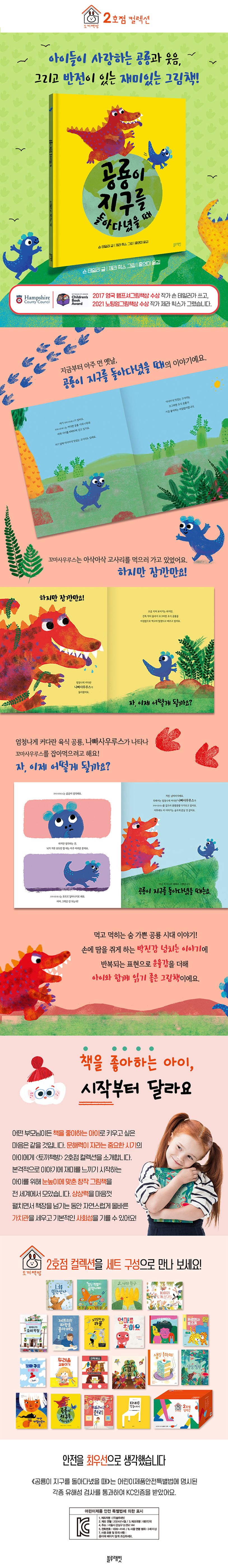 2017 영국 햄프셔그림책상 수상 작가 숀 테일러가 쓰고, 2021 노팅엄그림책상 수상 작가 제라 힉스가 그렸습니다. 아이가 본격적으로 책에 관심을 보이는 시기에 이야기에 재미를 붙일 수 있도록 도와주는 재미있는 그림책이에요. 원래부터 공룡을 좋아했던 아이라면 더욱 흥미롭게 읽을 수 있지요. 손에 땀을 쥐게 하는 박진감 넘치는 이야기 전개에 반복되는 표현으로 운율감을 더해 아이와 함께 소리 내어 읽기에도 좋아요.