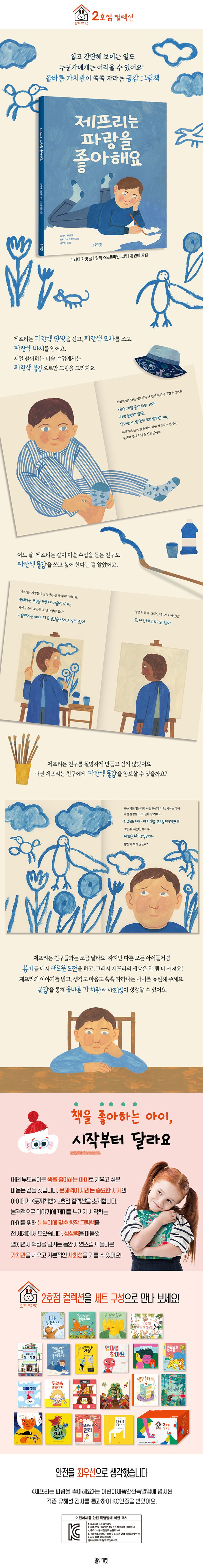 제프리는 파란색 양말을 신고, 파란색 속옷을 입고, 파란색 모자를 쓰고, 파란색 바지를 입어요. 제일 좋아하는 미술 수업에서는 파란색 물감으로만 그림을 그리지요. 제프리에게 파란색은 완벽한 색깔이에요. 어느 날, 제프리는 같이 미술 수업을 듣는 친구 케이도 파란색 물감을 쓰고 싶어 한다는 걸 알았어요. 제프리는 다른 색 물감으로 그림을 그리기 싫었지만, 친구를 실망시키고 싶지도 않았어요. 과연 제프리는 친구에게 물감을 양보할 수 있을까요?