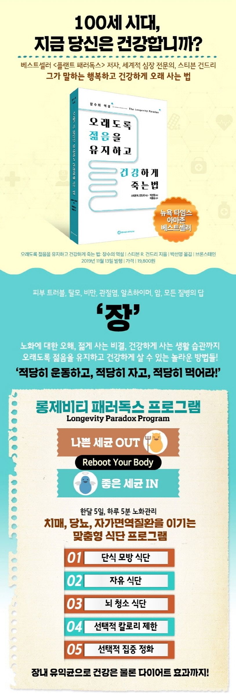 세계적인 심장 전문의 스티븐 건드리 박사가 건강하게 잘 늙는 법을 새로운 각도에서 접근하는 『오래도록 젊음을 유지하고 건강하게 죽는 법』. 수천 명의 환자를 치료해오며 우리가 가장 두려워하는 노화로 인한 질병이 사실은 노화로 인해 생기는 자연스러운 현상이 아니라 우리가 살아가는 생활 방식이 만들어낸 결과물이라는 사실을 알아낸 저자는 장 건강을 개선하여 앞으로 살아갈 수십 년간 활력이 넘치는 삶이 될 수 있는 건강할 생활방식을 일목요연하게 제시한다.