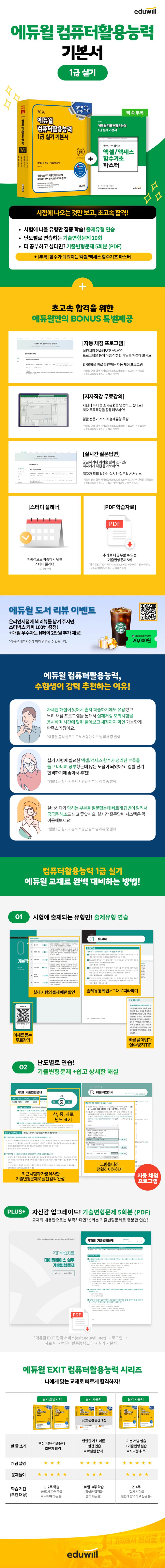 [이책의구성]1.출제유형만콕!짚어연습하는‘출제유형연습’-실제시험과동일한출제패턴을소개하고,풀이과정을그대로따라해볼수있는상세한설명수록-‘읽는강의’요소를통해빠른풀이법과실수방지TIP제공2.실전감각완성!‘총15회분기출변형문제’-최신출제경향을반영한난이도별기출변형문제10회분수록-더많은실전연습을위한기출변형문제5회분PDF특별제공[특별제공혜택]-[무료강의]출제패턴그대로따라하기8강-[함수기초마스터]복잡한함수만모아서정리한중철부록(교재내수록)-[스터디플래너]2/4주완성단기합격지원스터디플래너(교재내수록)-[실시간질문답변서비스]24시간내에저자가직접답변하는질문답변서비스-[채점프로그램]기출변형문제총15회분(PDF5회분포함)을자동으로채점해주는채점프로그램-[PDF추가자료]교재실습/정답파일,기출변형문제정답화면바로보기PDF제공