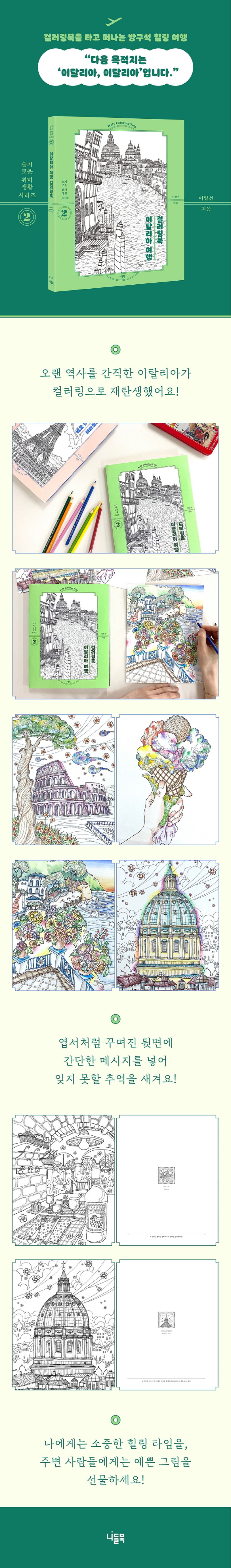 일상이 지루할 때, 휴식과 충전이 절실할 때, 여건상 여행 가기 힘들 때 《이탈리아 여행 컬러링북》에 몸을 싣고 상상 속 이탈리아로 떠나보자. 컬러링에 집중하다 보면 답답한 현실을 벗어나 마음의 평화를 찾을 수 있다.