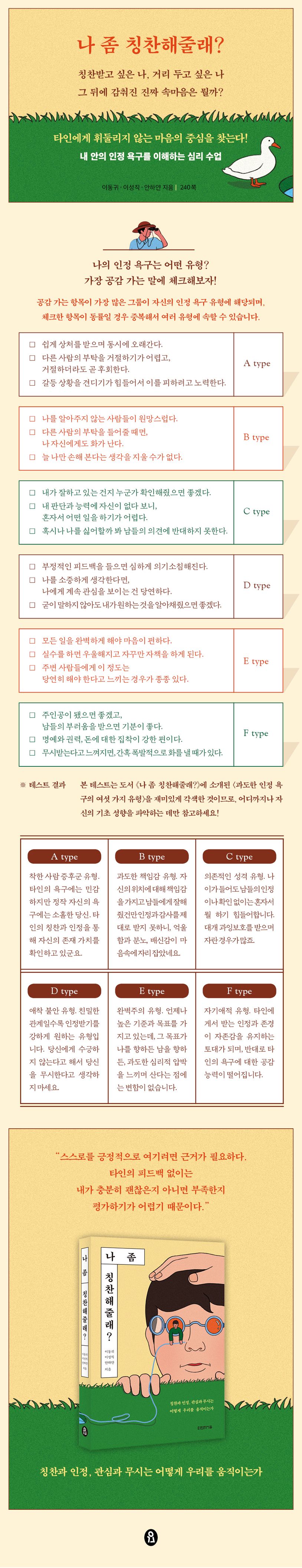 이 책은 그간 학술적으로 주로 다뤄지거나 외국 교양서에 의존해온 인정 욕구에 대해, 국내 최고의 상담 심리학자들이 고민과 경험을 담아 대중의 눈높이에서 풀어낸 심리 교양서이다. 나날이 커지는 인정 욕구가 우리의 삶에 어떤 영향을 끼치는지를 다각도로 살펴보고, 이를 긍정적으로 활용하기 위한 심리학적 해법을 담았다. 자꾸만 타인의 시선을 의식하게 되는 우리 모두에게, 지적 통찰을 통한 묵직한 울림을 선사할 것이다.