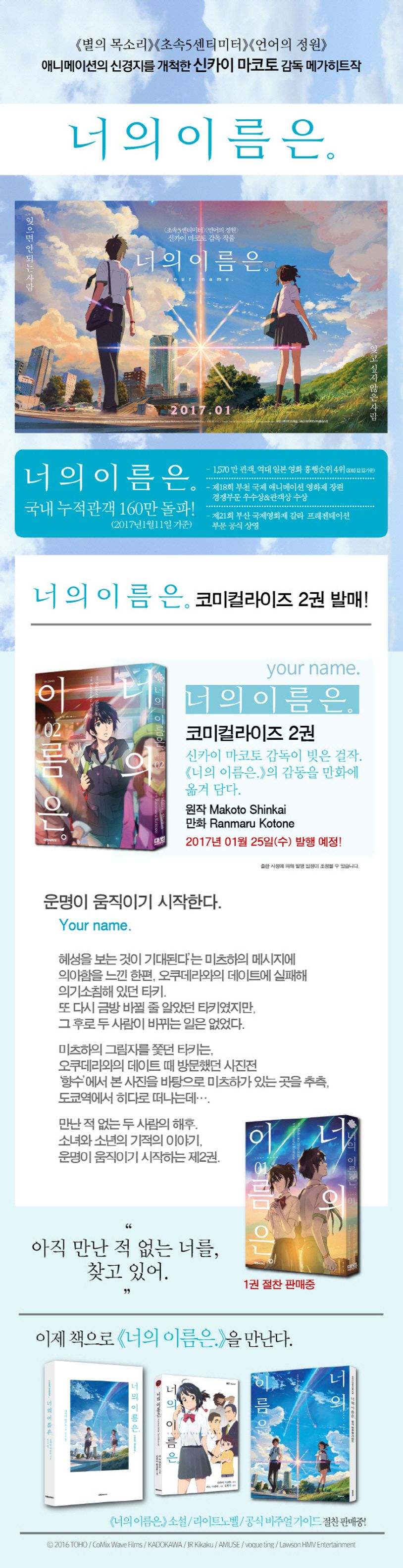 1500만 관객을 동원하며 역대 일본영화 흥행순위 5위를 기록한 신카이 마코토 감독의 작품 『너의 이름은』 제2권. 혜성을 보는 것이 기대된다는 미츠하의 메시지에 의아함을 느낀 한편, 오쿠데라와의 데이트에 실패해 의기소침해 있던 타키. 또 다시 금방 바뀔 줄 알았던 타키였지만 그 후로 두 사람이 바뀌는 일은 없었다. 미츠하의 그림자를 쫓던 카키는, 오쿠데라와의 데이트 때 방문했던 사진전 '향수'에서 본 사진을 바탕으로 미츠하가 있는 곳을 추측, 도쿄역에서 히다로 떠나는데….