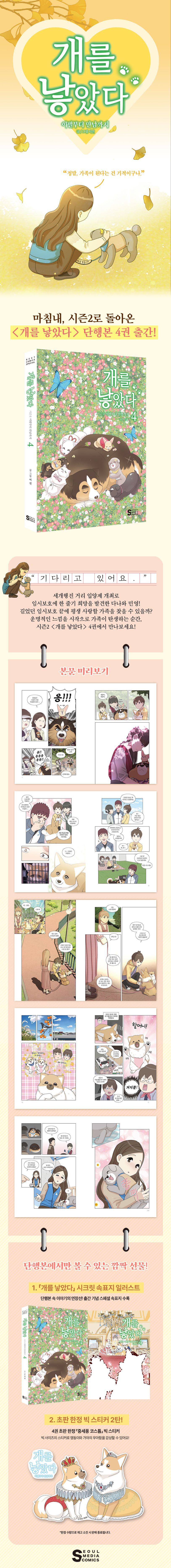 시즌2 〈개를 낳았다〉 4권은 웹툰 연재 회차 시즌2 40화~52화까지의 이야기가 담겼으며 단행본 초판에는 특별 부록 ‘명동&가야 콤비의 중세풍 코스튬 빅스티커‘가 들어있습니다.