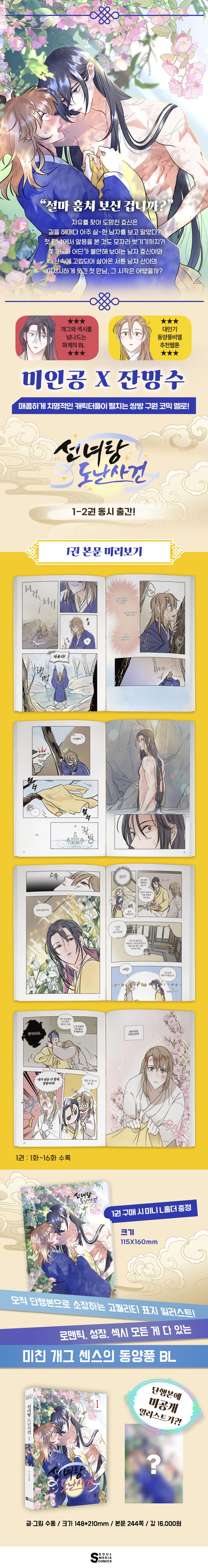 《선녀탕 도난사건》은 섬세하고 수려한 작화에 미친 개그 센스를 버무린 무해한 매력이 돋보이는 작품이다. 우연한 만남에서 시작해 운명적 사랑에 빠지는 두 사람의 관계 변화를 아슬아슬한 수위까지 아찔하게 몰아붙이는 묘사로 극적 설렘과 재미를 선사한다. 외롭던 두 사람이 만나 애틋한 성장을 이루는 찬란한 이야기를 몰입감이 배가 되는 페이지 연출로 만나보자.