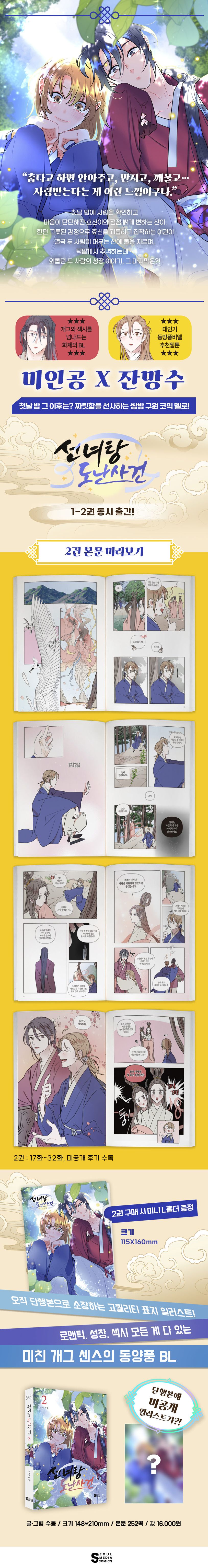 《선녀탕 도난사건》은 섬세하고 수려한 작화에 미친 개그 센스를 버무린 무해한 매력이 돋보이는 작품이다. 우연한 만남에서 시작해 운명적 사랑에 빠지는 두 사람의 관계 변화를 아슬아슬한 수위까지 아찔하게 몰아붙이는 묘사로 극적 설렘과 재미를 선사한다. 외롭던 두 사람이 만나 애틋한 성장을 이루는 찬란한 이야기를 몰입감이 배가 되는 페이지 연출로 만나보자.