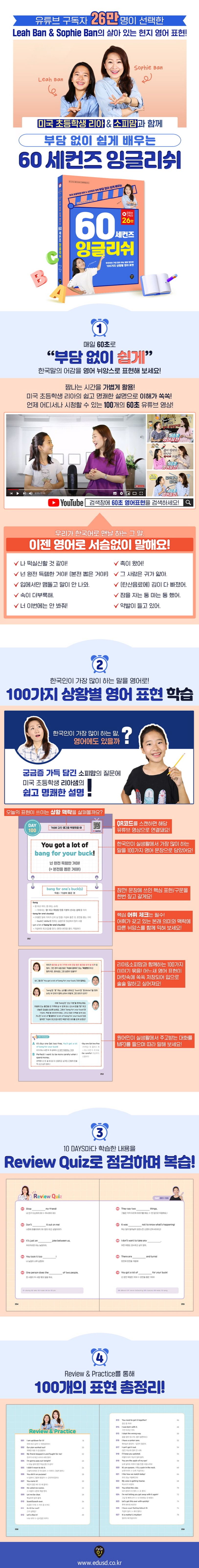 본 도서는 26만 명의 구독자를 보유하고 있는 영어 교육 유튜브 채널 Sophie Ban(소피반)에서 인기리에 운영하고 있는 영어 학습 콘텐츠인 ‘60초 영어 표현’을 담고 있는 도서로, 이미 수많은 구독자들에게 ‘정말 쉽고 실생활에 도움이 되는 영어 콘텐츠’로 검증된 내용의 학습서이다.
