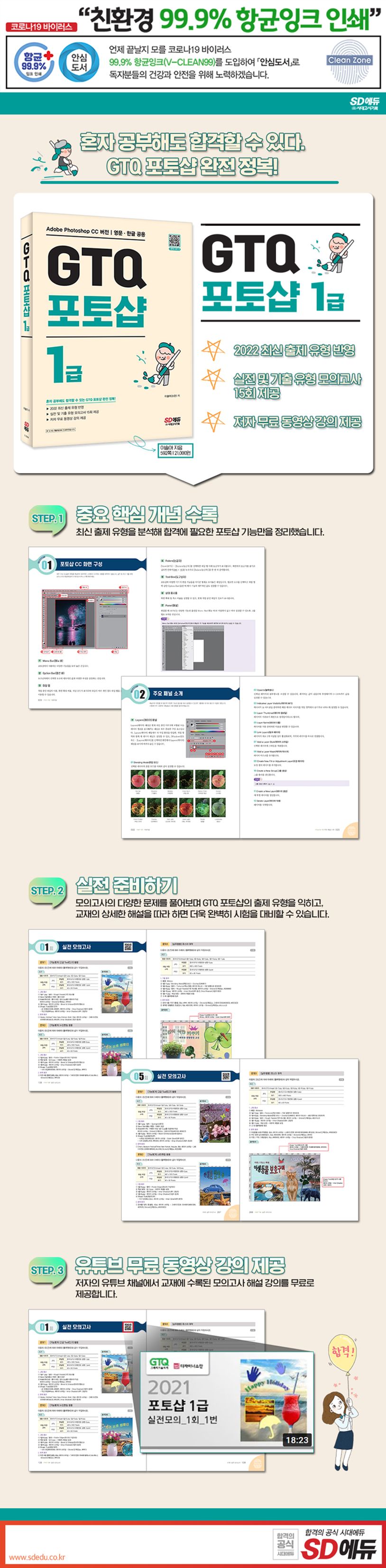 이 책은 한국생산성본부에서 주관하는 GTQ 포토샵 1급 자격증을 대비하는 수험서로 Adobe Photoshop CC 최신 버전으로 구성하였으며 2022년 출제 경향을 완벽히 반영했습니다. 시험에 자주 출제되는 포토샵 기능만 압축 정리해 포토샵 프로그램에 익숙하지 않은 입문자도 단기간에 기본 툴을 익힐 수 있고, 실전 모의고사 등 총 15회의 다양한 문제를 풀어보며 실전 감각을 높일 수 있습니다. 또한, 이 책의 저자가 운영하는 유튜브 채널의 무료 동영상 강의를 통해 GTQ 포토샵 1급 자격증을 누구나 쉽고 빠르게 취득할 수 있습니다.