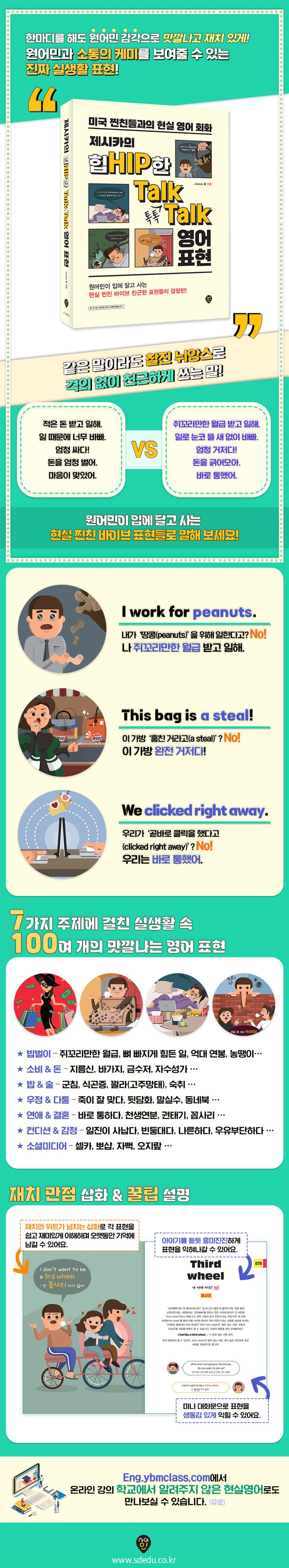 원어민과 소통의 케미를 보여줄 수 있는 진짜 실생활 표현들이 수록되어 있습니다! 한국어에도 ‘쥐꼬리만한 월급, 지름신, 꽐라(고주망태), 농땡이, 꼽사리’와 같이 교과서엔 나오지 않지만 실제 입에 달고 사는 맛깔나고 재미있는 표현들이 많이 있습니다. 왕초보부터 중고급 영어회화 학습자들까지 이러한 표현 100여 개를 재치와 위트가 넘치는 삽화와 함께 쉽고 즐겁게 익힐 수 있습니다.
